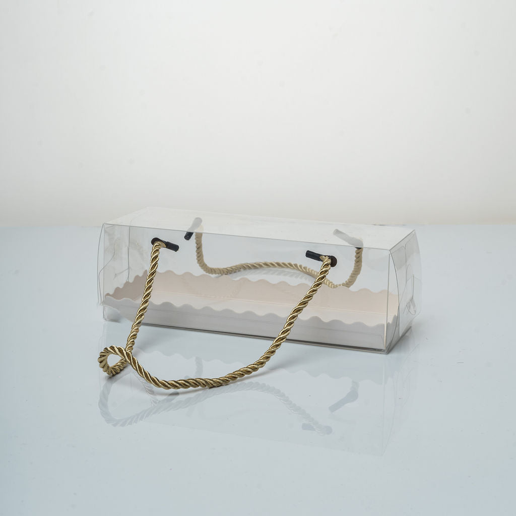Découvrez la boîte transparente avec poignées cordelettes, mesurant 6,5x6,5x18,5cm, une solution d'emballage élégante et pratique pour divers articles.