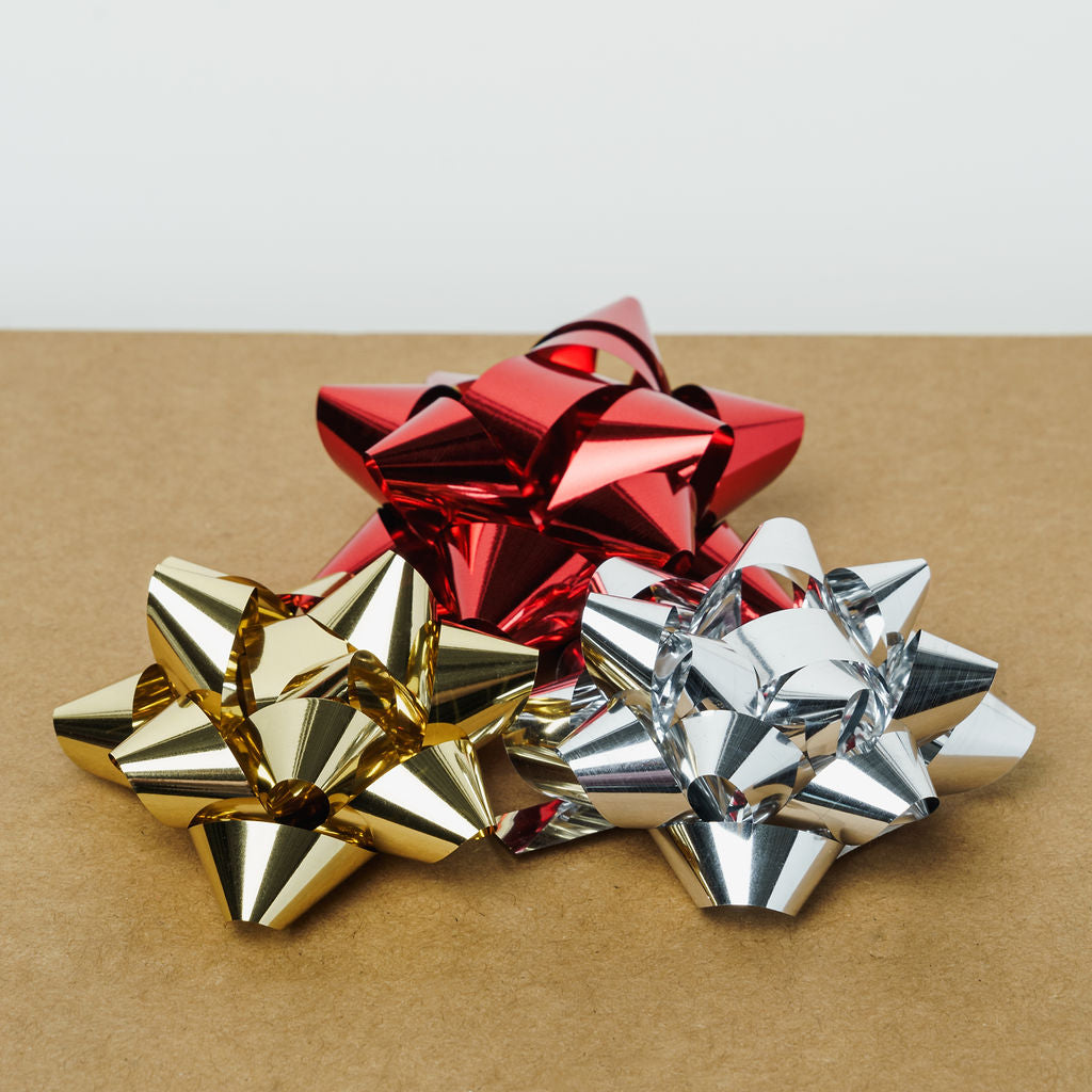 Découvrez nos nœuds adhésifs panachés de 6,35 cm de diamètre, alliant l'élégance de l'or et de l'argent avec la chaleur du rouge, des accessoires pratiques et polyvalents pour sublimer vos emballages et décorations.