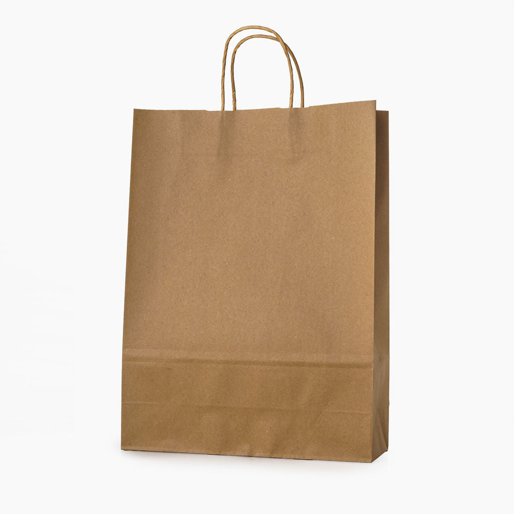 Découvrez les sacs kraft à poignées torsadées Kraft L.31x l.11,5x H.42cm, une solution d'emballage pratique et esthétique pour une variété d'articles.